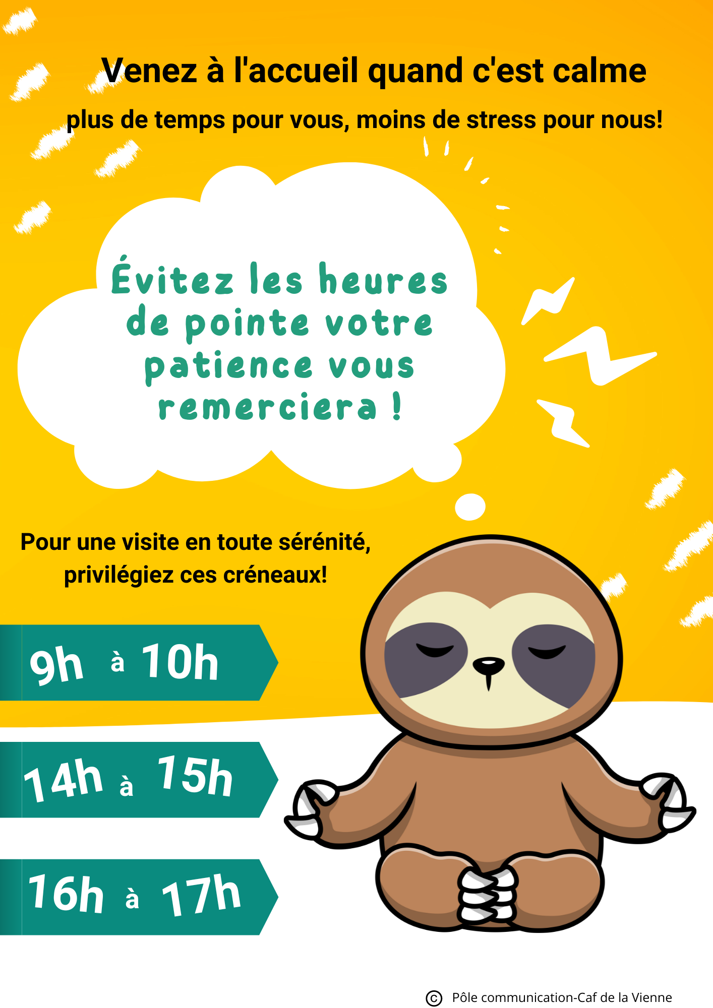 Affiche A3 pour inciter le public à se présenter à l'accueil lors des heures creuses.